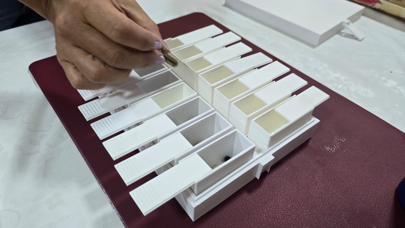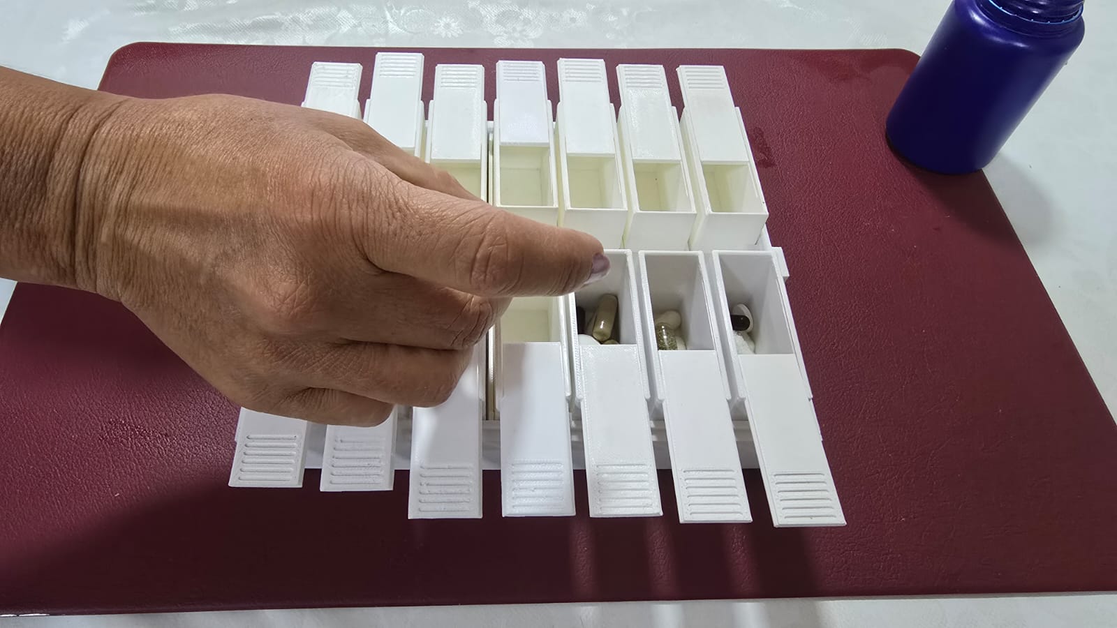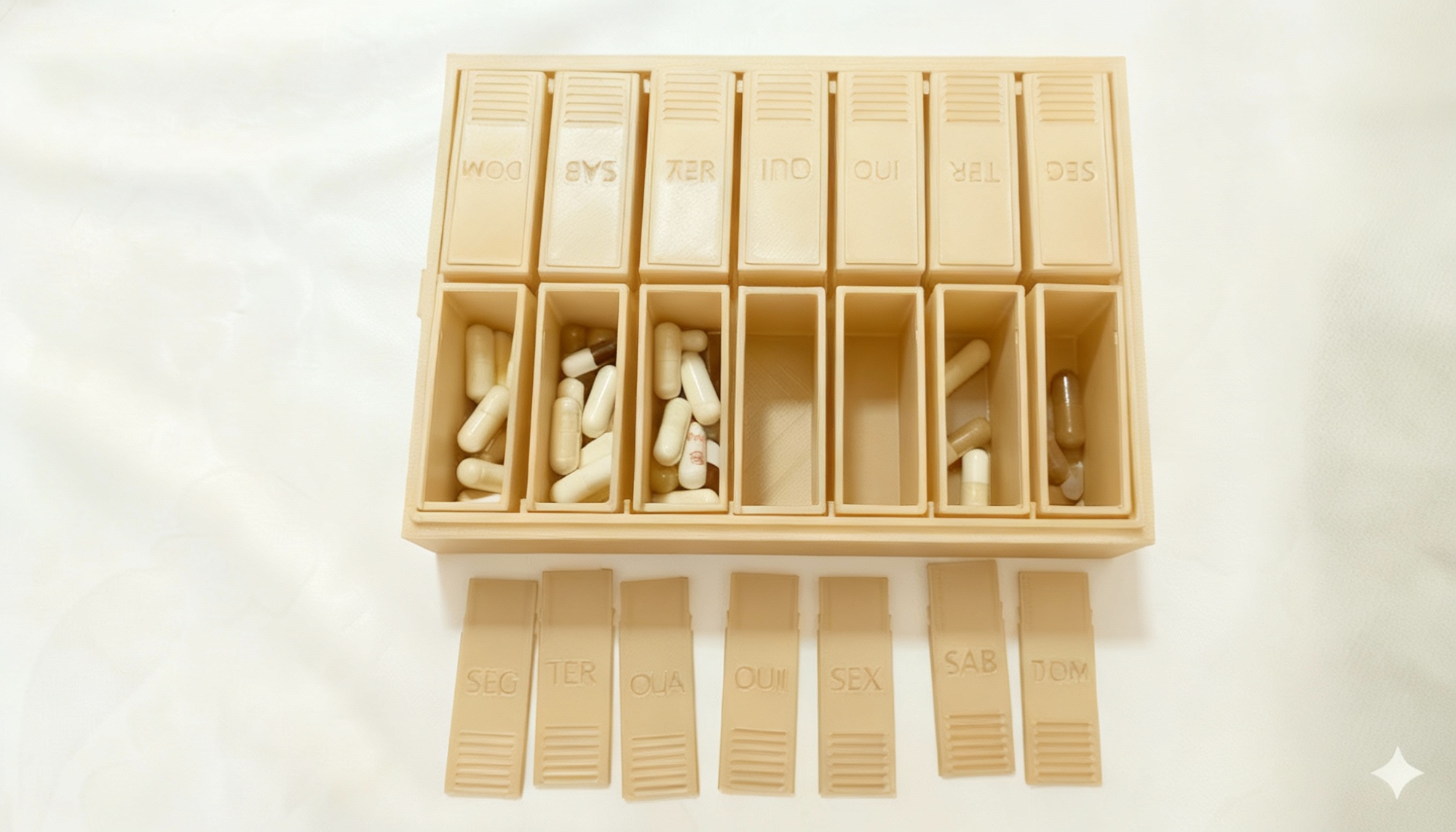 – 14 caixas internas individuais (SEG a DOM), cada uma com divisória exclusiva.